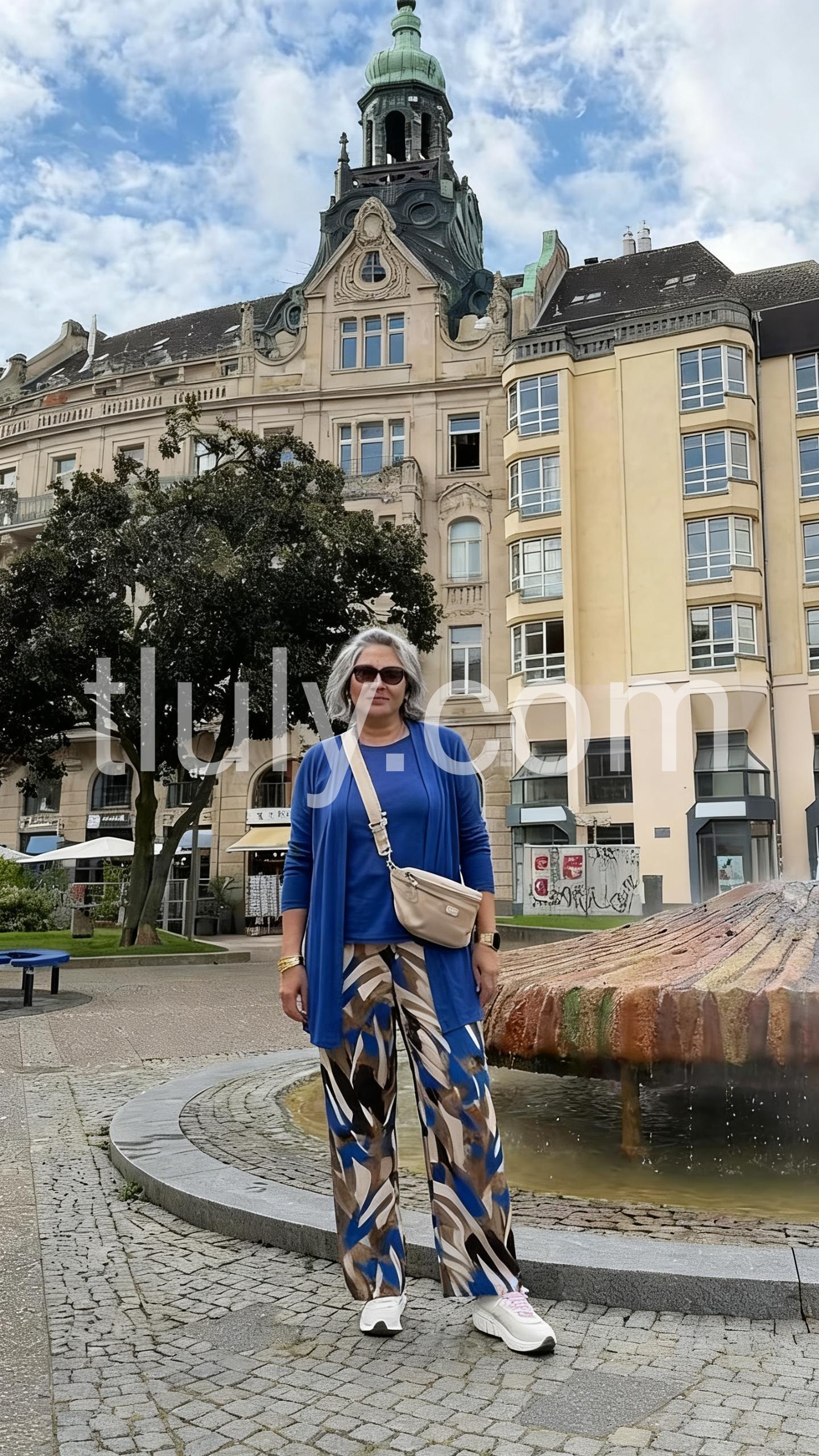 This coordinated outfit features a sleek blue cardigan over a matching top. The wide-leg palazzo pants have a bold abstract print in blue, beige, and black. Perfect for casual elegance or relaxed outings. Lightweight fabrics ensure comfort all day. Ideal for spring and summer wear.