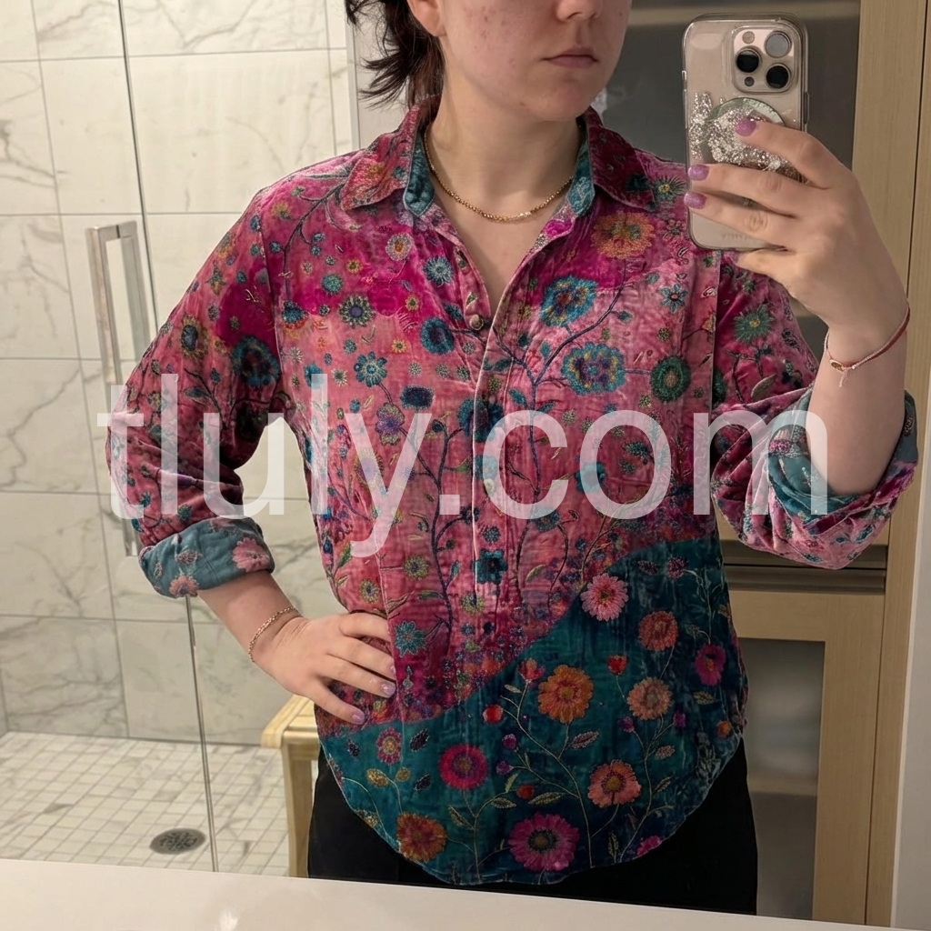 This long-sleeve shirt features a colorful floral print with a bold purple and teal color block design. The relaxed fit and classic collar offer effortless style. Perfect for pairing with jeans or denim shorts. Ideal for bohemian-inspired looks. Lightweight and eye-catching for casual days.