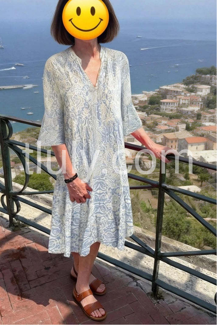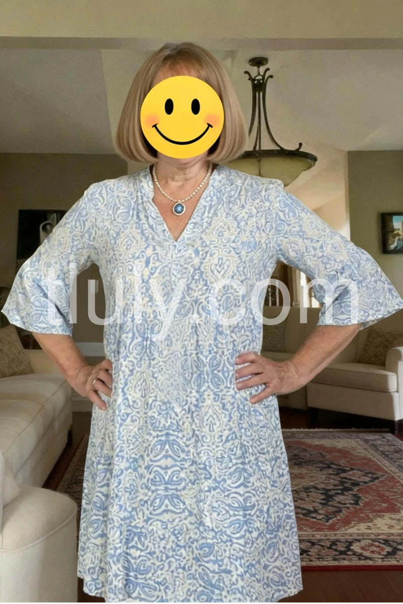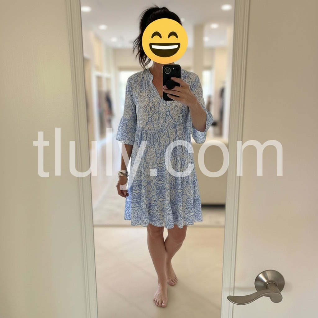 Weathered Blue White Vintage Print Half Sleeve Mini Dress