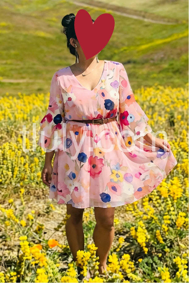 Style# 1544501Embrace soft romance and effortless style in this Pink Watercolor Floral 3/4 Sleeve Mini Dress , a dreamy mini dress that captures the beauty of blooming spring. Crafted from lightweight, flowing fabric—likely chiffon or rayon blend—this dress features a delicate watercolor-inspired floral print in vibrant shades of pink, coral, navy, yellow, and white, creating a painterly effect across the soft blush base. The flattering V-neckline adds a touch of elegance, while the short ruffle sleeves bring playful volume and feminine charm. A relaxed, A-line silhouette ensures comfort and ease, making it perfect for casual days, brunches, or warm-weather outings. Paired here with layered bracelets and a pearl necklace, it exudes boho-chic appeal. Ideal for beach trips, garden parties, or weekend strolls, this dress brings a sense of lightness, joy, and timeless femininity to your wardrobe. Let this floral mini dress turn every moment into a gentle celebration of color and style.