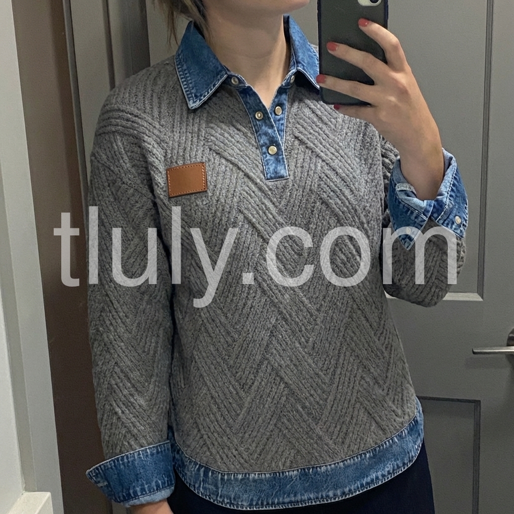 Grey Herringbone Knit Denim Collar Sweater