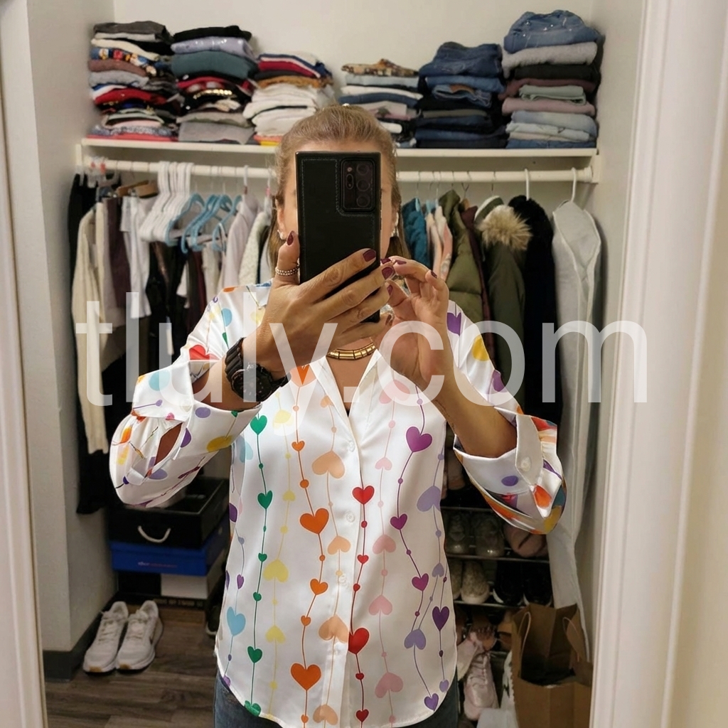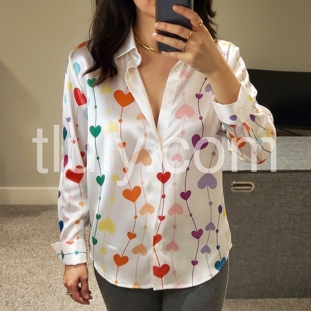 Elevate your wardrobe with this sophisticated satin blouse, featuring an enchanting heart print that adds a touch of romance to any ensemble. Crafted from luxurious satin fabric, this long-sleeve piece drapes beautifully while maintaining a polished silhouette. The smooth, lustrous finish catches light gracefully, making it ideal for both professional settings and evening occasions. Versatile enough to pair with tailored trousers or flowing skirts, this blouse seamlessly transitions from day to night. Perfect for those seeking refined elegance with a subtle hint of charm.