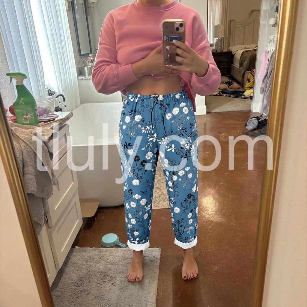 These relaxed-fit pants feature a vibrant blue base with white and black floral patterns. Elastic waistband and cuffed hems offer a cozy, tailored look. Perfect for casual outings or beach days. Lightweight fabric ensures all-day comfort. Effortlessly chic with a bohemian touch.