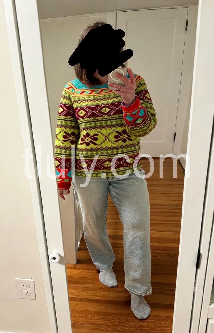 This sweater is such a fun and vibrant addition to my wardrobe! The mix of bright lime green, deep burgundy, and pops of turquoise in the classic fair isle pattern is so eye-catching—you can’t help but smile when you put it on.