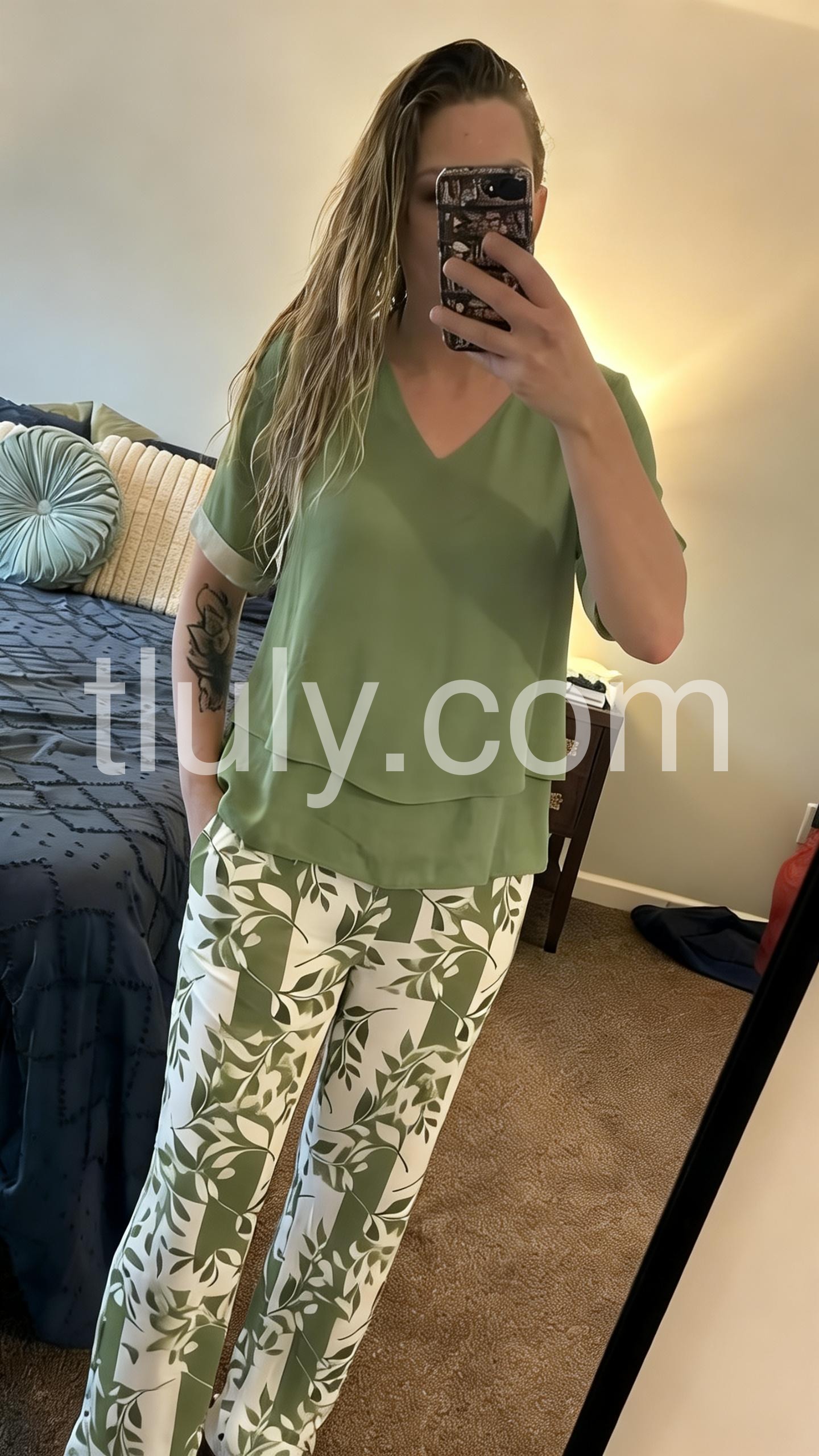 This coordinated set features a solid green V-neck top with a layered hem and rolled sleeves. Paired with white pants in a leafy green pattern for a natural, airy look. Lightweight fabric perfect for casual wear. Ideal for everyday comfort or light outings. Effortlessly stylish and easy to wear.