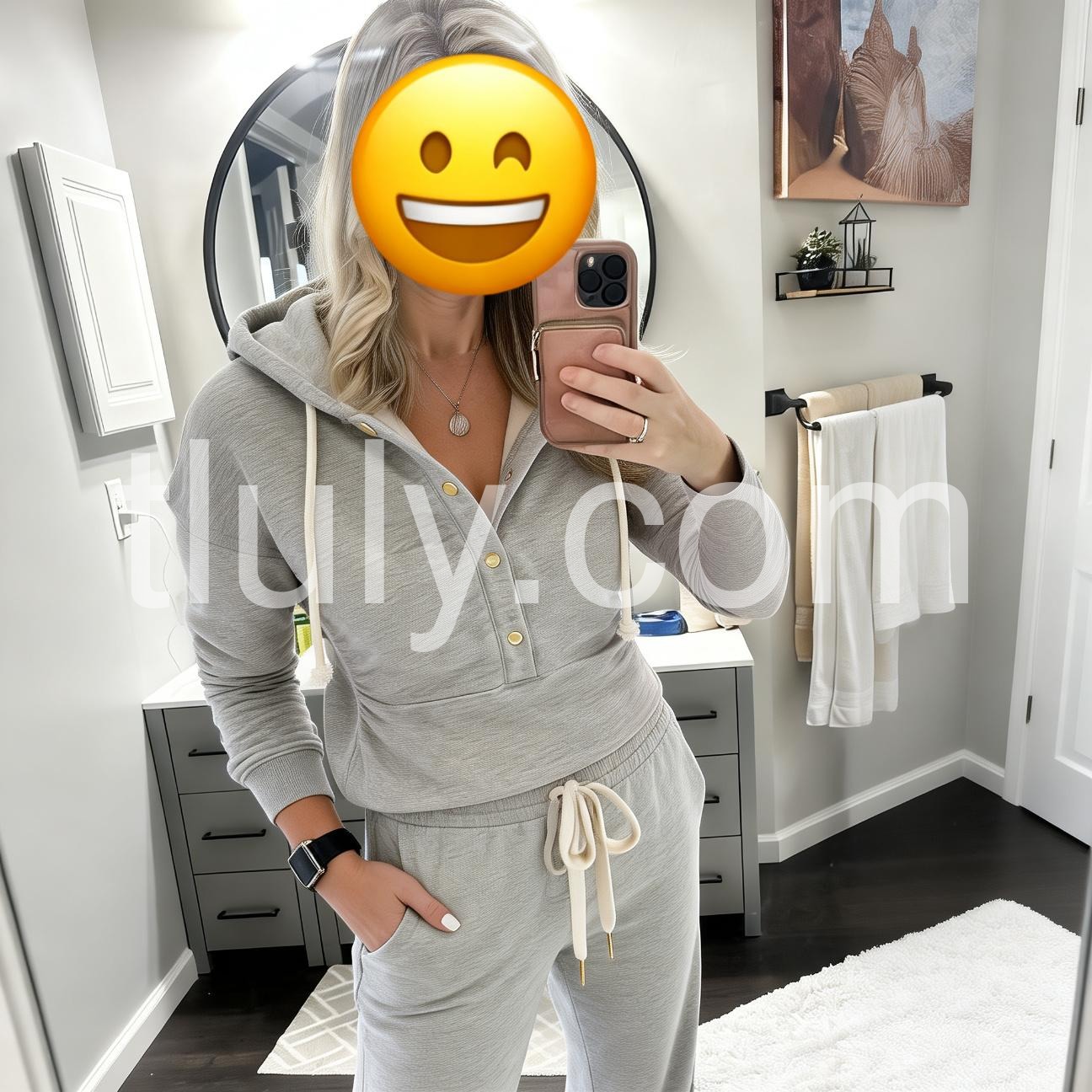 Loungewear gets an upgrade with this stellar heather grey set cute enough to wear all over town. A warm hoodie with golden snaps and a kangaroo pocket coordinates with slim sweatpants featuring a fashionable lace-up top and slant pockets. Layer it with a lace-trimmed camisole for a modern, flirty touch.