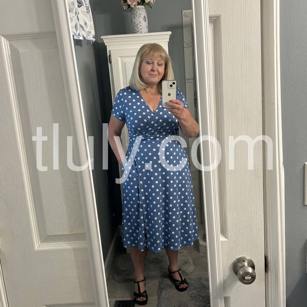 This mid-length wrap dress features a chic blue base with white polka dots. V-neckline and short sleeves for a timeless look. Fitted waist with flared skirt for a flattering silhouette. Perfect for beach outings or casual events. Sophisticated and effortless style.