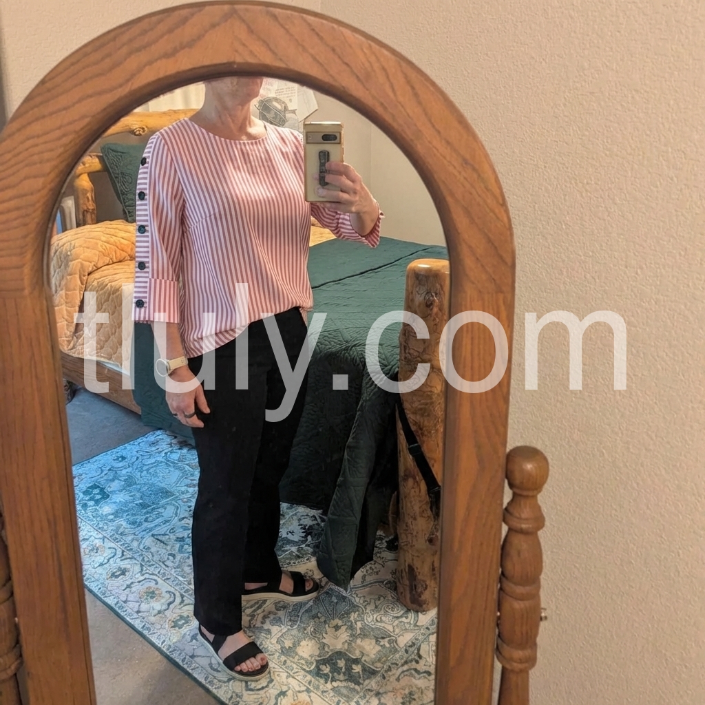 his loose-fit top features vertical pink and white stripes with stylish button details on the sleeves. Three-quarter sleeves with rolled cuffs offer a relaxed look. Round neckline for a clean, comfortable fit. Perfect for casual wear or smart-casual outfits. Bright and cheerful with a touch of elegance.