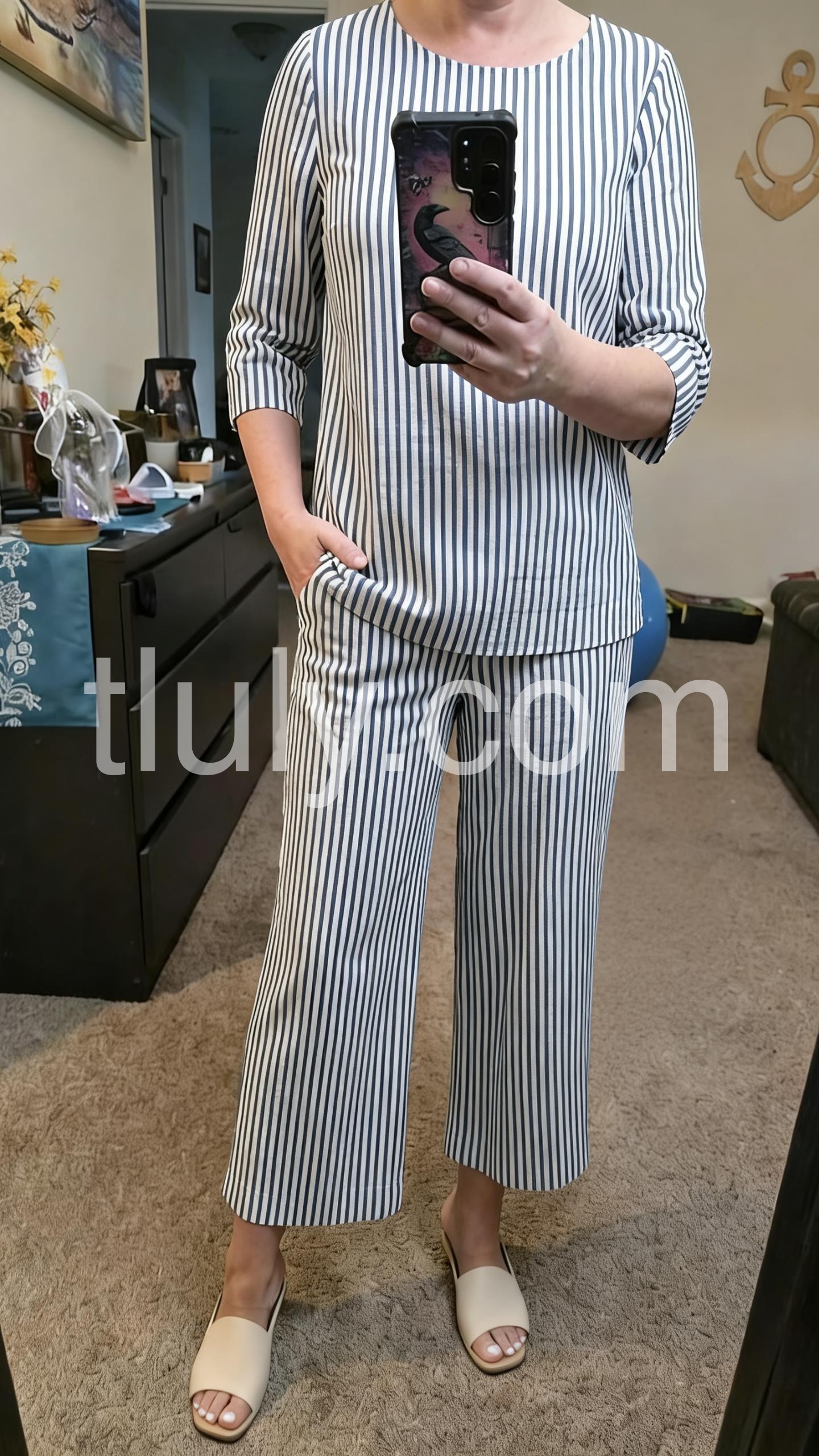 This coordinated set features a relaxed-fit top and wide-leg cropped pants in classic blue and white stripes. The three-quarter sleeves and round neckline offer a clean, timeless look. Lightweight fabric perfect for warm weather. Ideal for casual outings or smart-casual events. Effortlessly chic and easy to style.