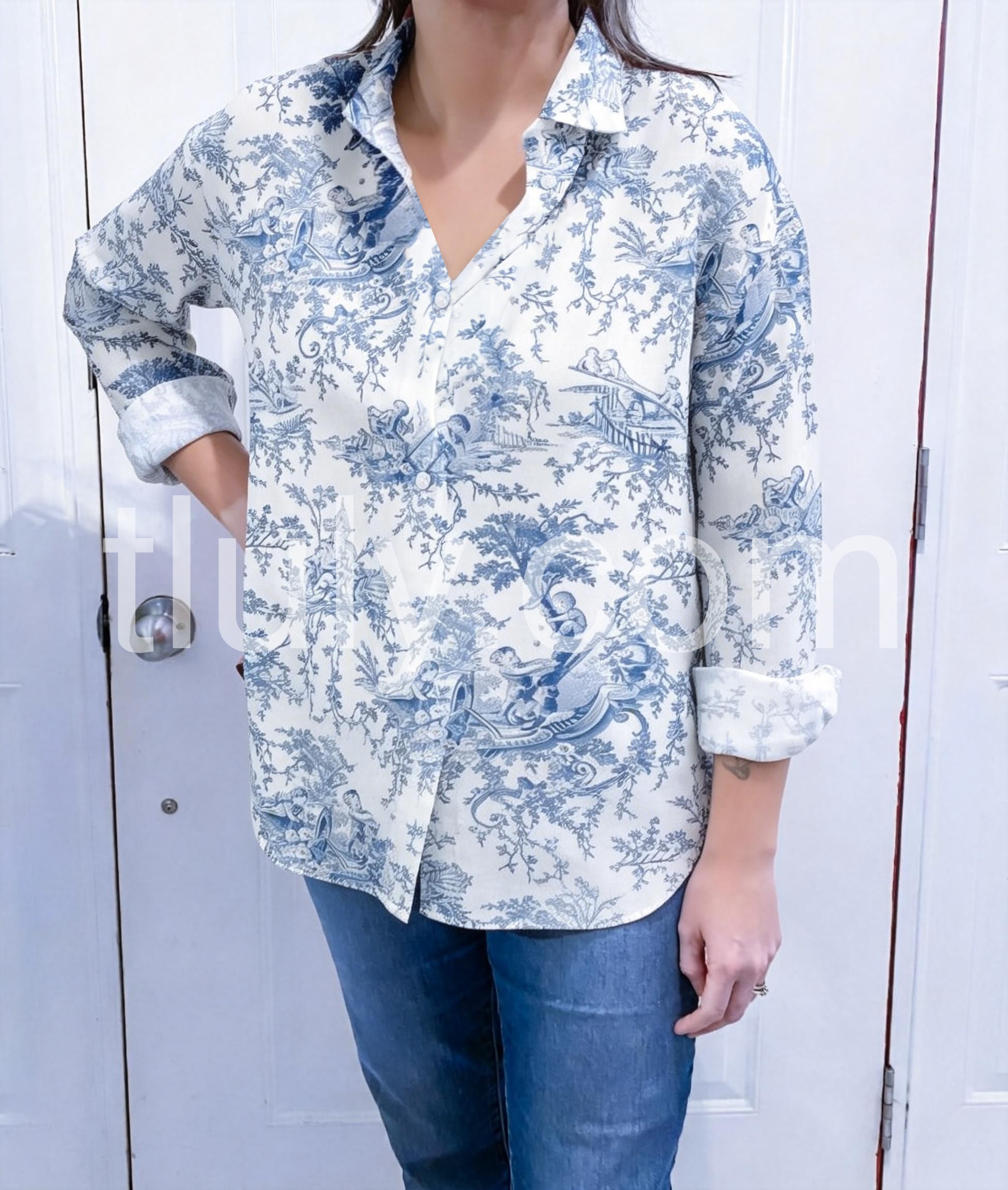 Elevate your wardrobe with this Romantic Blue Floral Print Button Down Shirt, a refined piece that blends vintage charm with modern sophistication. Crafted from lightweight, breathable cotton or cotton-blend fabric, this long-sleeve shirt features an elegant toile de Jouy print—featuring delicate blue pastoral scenes of trees, figures, and floral motifs on a crisp white background—inspired by traditional French design. The clean collar and full button-down front offer a polished look, while the slightly relaxed fit ensures comfort and ease. Roll up the sleeves for a casual, lived-in vibe or keep them down for a more tailored appearance. Perfectly paired with jeans, denim shorts, or high-waisted trousers, it’s ideal for brunch dates, weekend outings, or office-to-evening transitions. Inspired by the curated, effortlessly chic styles found on Lulus.com, this blouse brings timeless elegance to any outfit. A must-have for those who love classic patterns, subtle romance, and wearable artistry. Let this shirt carry you through spring and summer with grace, style, and a touch of old-world charm.