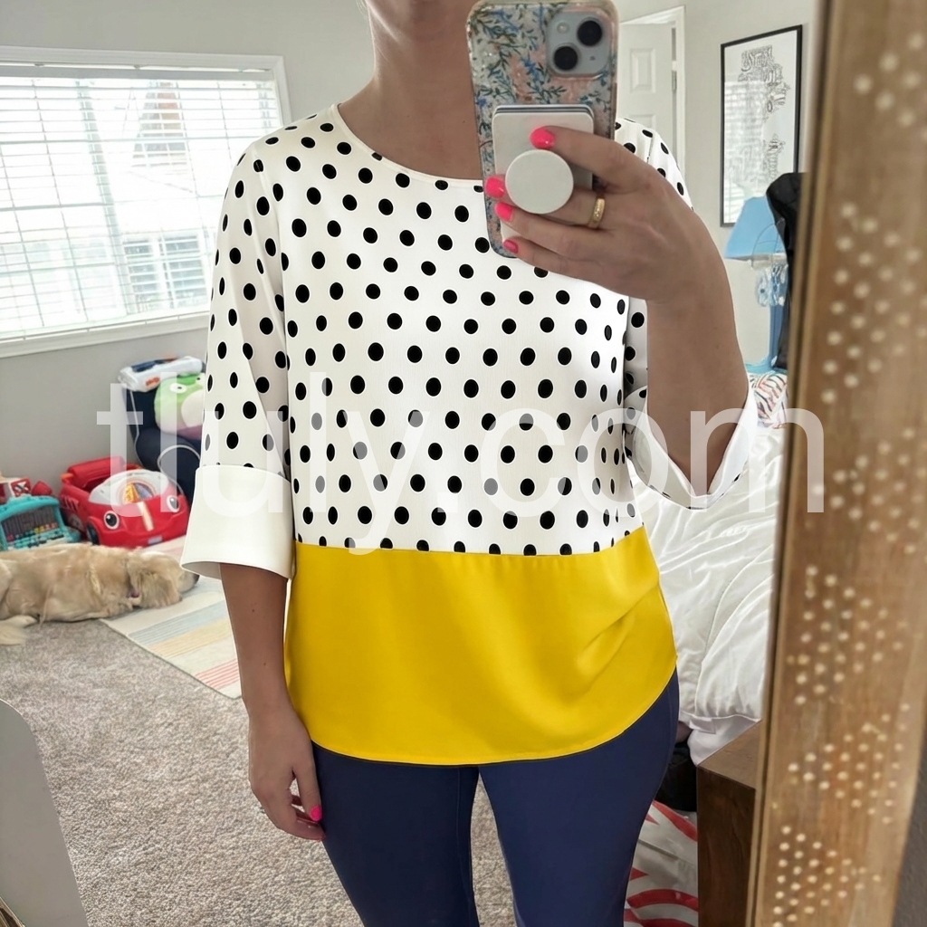 This fashion-forward top features a white base with black polka dots and a vibrant yellow hem. Three-quarter sleeves with rolled cuffs for a modern touch. Relaxed fit and round neckline for comfort. Perfect for casual wear or adding a pop of color to any outfit. Effortlessly chic and eye-catching.