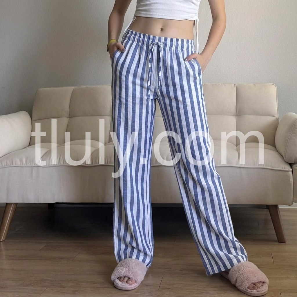 These relaxed-fit pants feature bold vertical stripes in navy and white. Elastic waistband with drawstring for comfort. Wide-leg design and lightweight fabric perfect for summer. Ideal for beach outings or casual wear. Effortlessly stylish and breezy.