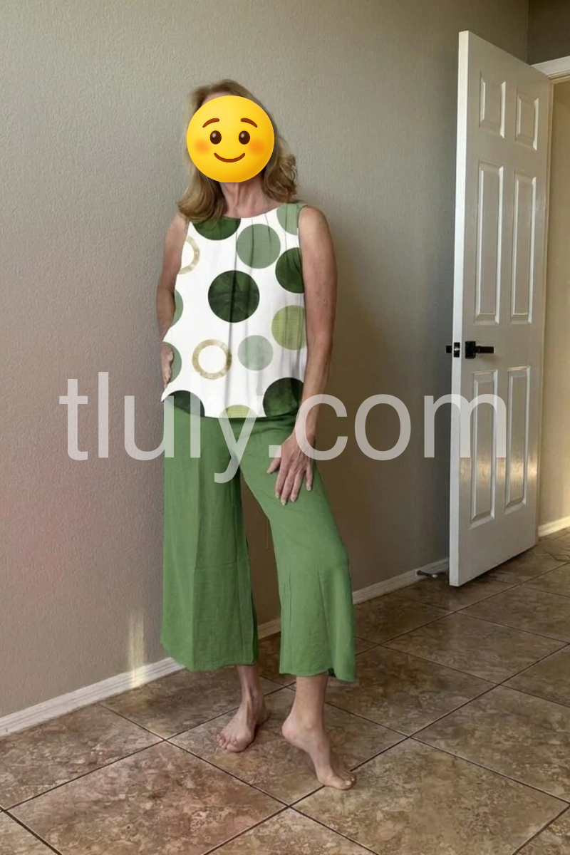 This coordinated set features a sleeveless top with bold green polka dots on a white background. Paired with solid olive-green wide-leg pants for a clean, contemporary look. Lightweight and comfortable fabric ideal for everyday wear. Perfect for casual outings or relaxed summer days. Stylish and easy to style.