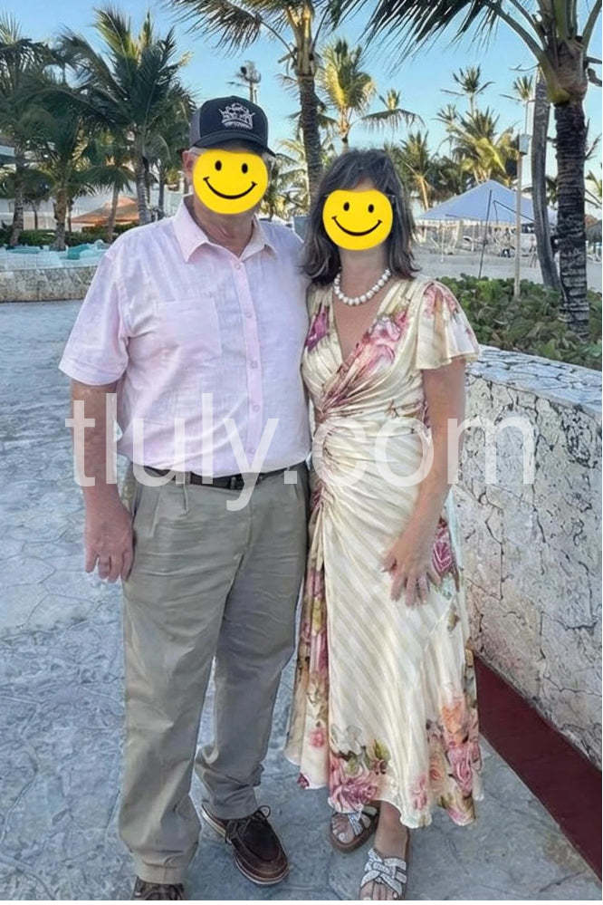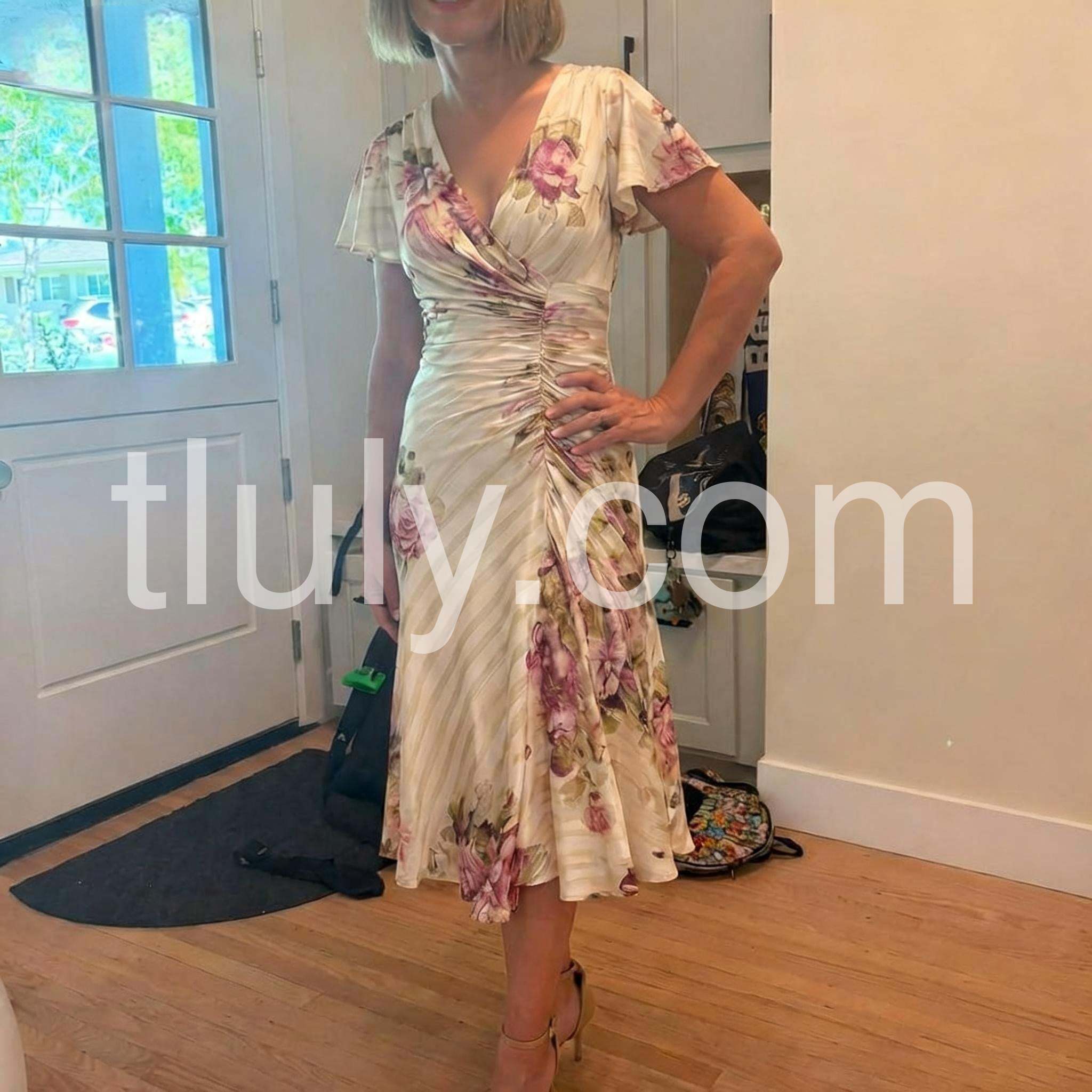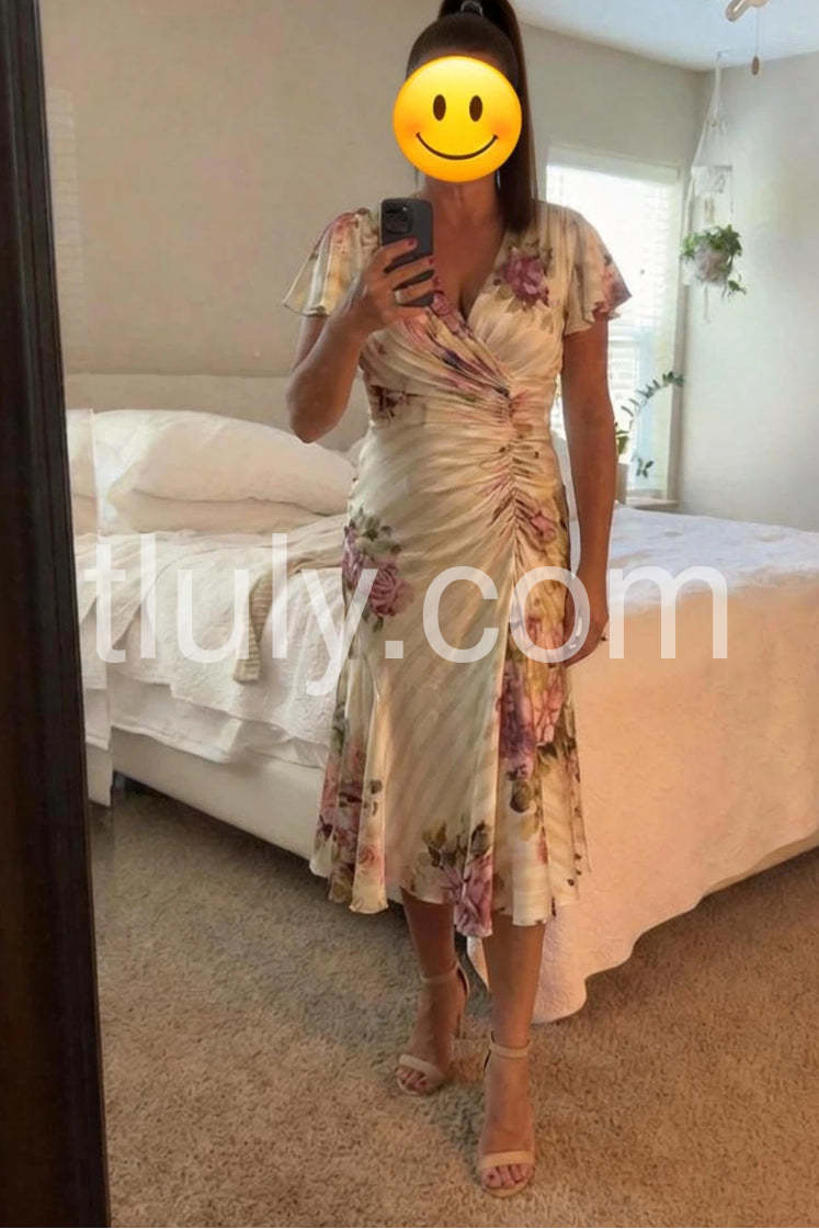 This exquisite cream satin midi dress exudes timeless elegance with its soft floral print of blush pink roses and delicate greenery, set against a subtle striped background. The wrap-style design features a deep V-neckline and a ruched waist that accentuates the figure, creating a flattering silhouette. Flutter sleeves add a romantic touch, while the flowing A-line skirt moves gracefully with every step. Crafted from luxurious satin fabric, it has a smooth, lustrous finish perfect for special occasions or sophisticated evening wear. Paired with strappy heels, layered necklaces, and a small clutch, this dress captures vintage charm with modern refinement. Ideal for garden parties, bridal showers, or elegant dinners, it’s a statement piece that blends femininity, grace, and classic beauty—making it a must-have for any fashion-forward wardrobe.