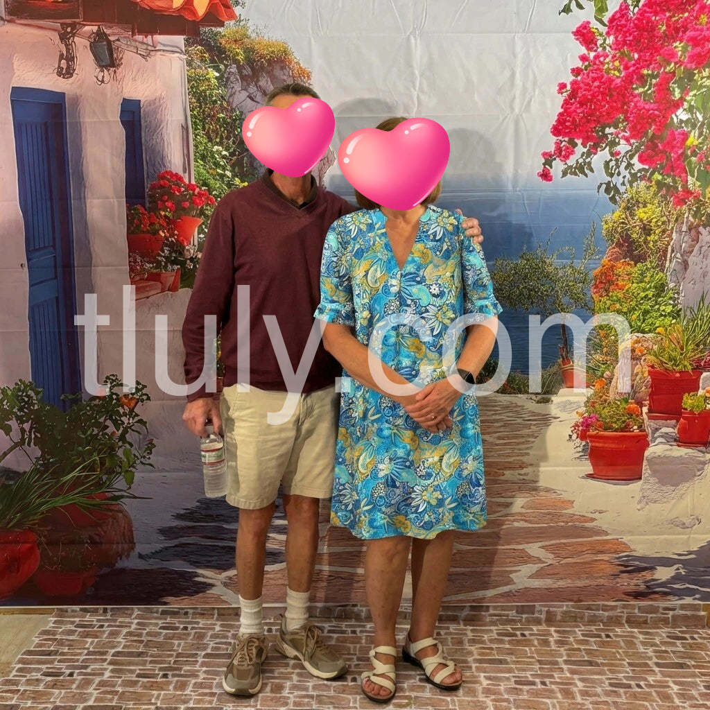 This cheerful and eye-catching summer dress features a bold, tropical-inspired floral print in vivid shades of blue, yellow, and white, creating a lively and festive look perfect for warm weather. Designed with a flattering V-neckline and short sleeves that roll up at the cuffs, it offers both style and comfort. The loose, A-line cut flows gracefully over the body, making it ideal for casual outings, beach days, or vacation adventures. Made from lightweight, breathable fabric, this dress ensures coolness and ease of movement. Pair it with sandals, a straw bag, and sunglasses for a complete bohemian-chic ensemble. Whether you're strolling through the city or relaxing by the sea, this dress brings vibrant energy and effortless charm to any summer wardrobe.
