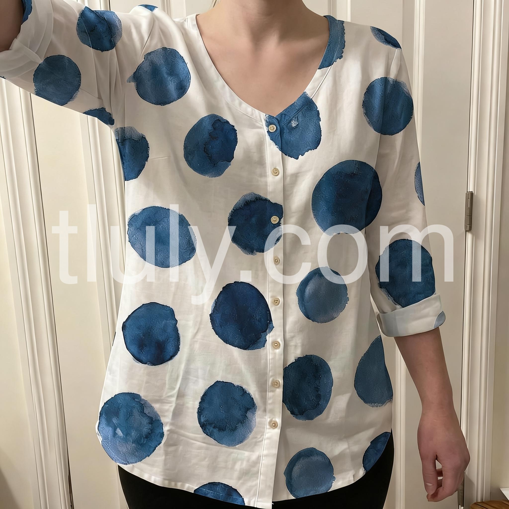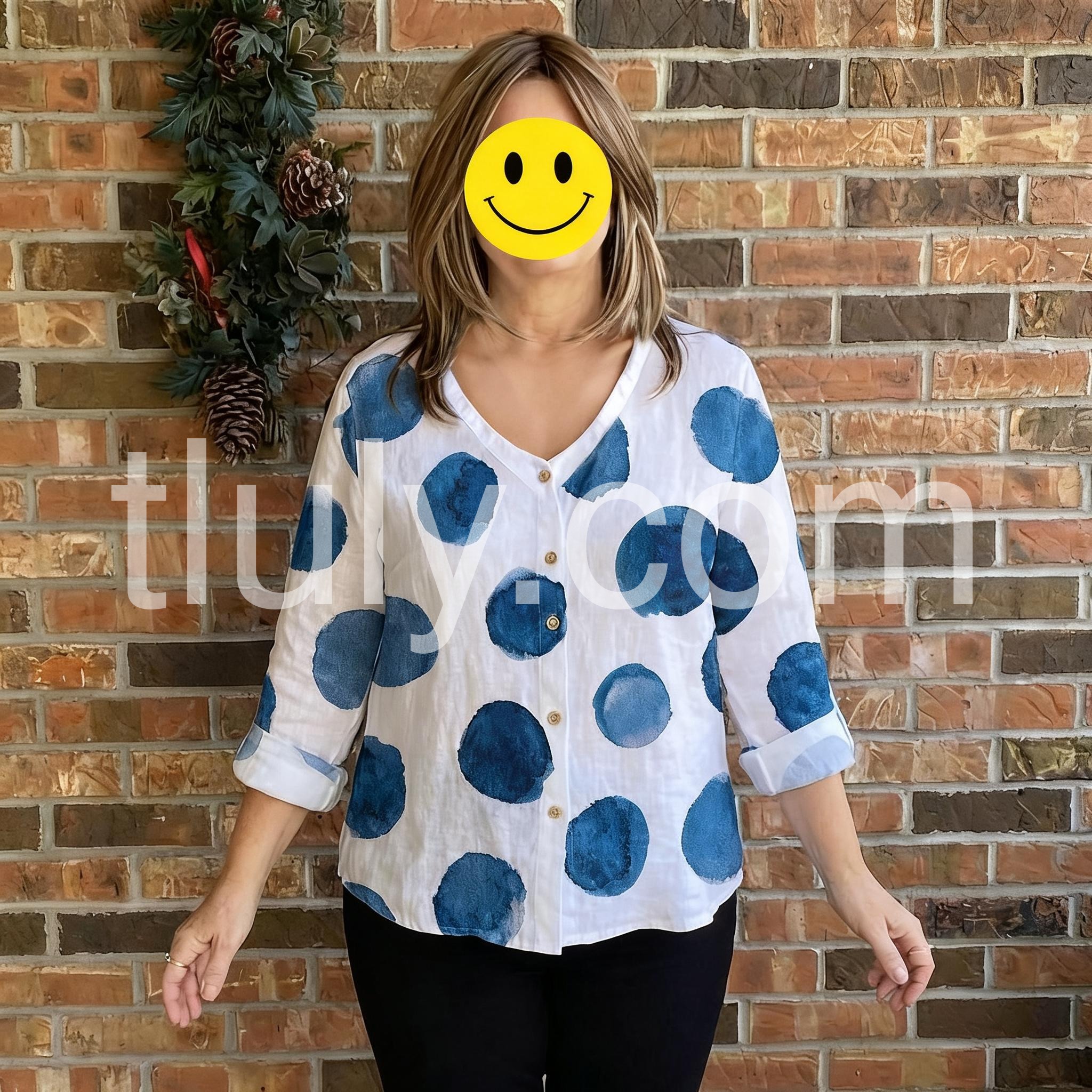 This button-down blouse features a playful watercolor polka dot print in navy blue on a crisp white background. The V-neckline and three-quarter sleeves offer a relaxed, comfortable fit. Lightweight fabric makes it perfect for everyday wear. Pair with jeans or shorts for a stylish casual look. Effortlessly trendy with a touch of artistic flair.