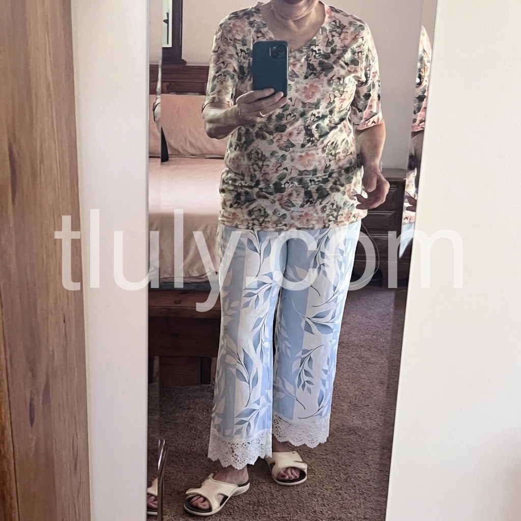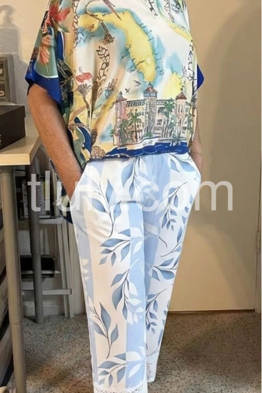 These flowy wide-leg pants feature a soft blue and white leaf pattern with a delicate lace hem. Elastic waistband and side pockets for comfort. Lightweight fabric perfect for warm days. Ideal for beachwear or casual summer styles. Elegant and breezy design.