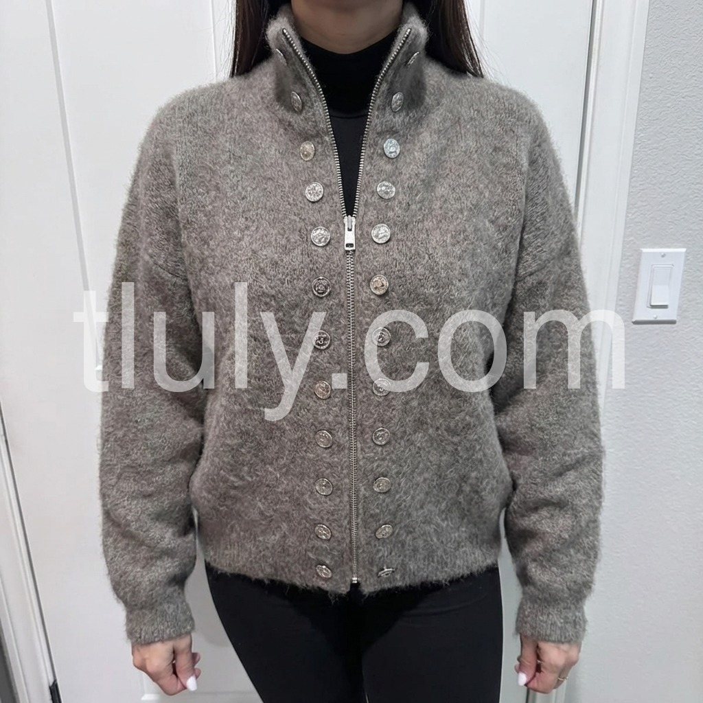 Fuzzy Grey High Neck Long Sleeve Cardigan