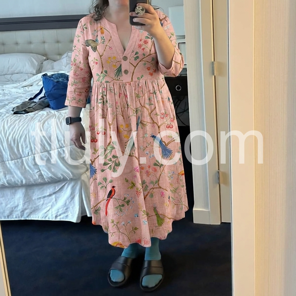This three-quarter sleeve dress features a soft pink base with colorful birds and floral patterns. The V-neck and button front add vintage appeal. Side pockets offer comfort and convenience. Lightweight fabric perfect for spring and summer. Ideal for casual outings or garden parties.