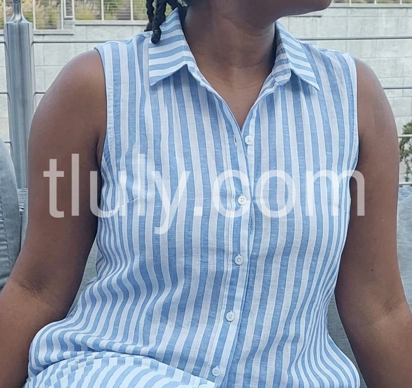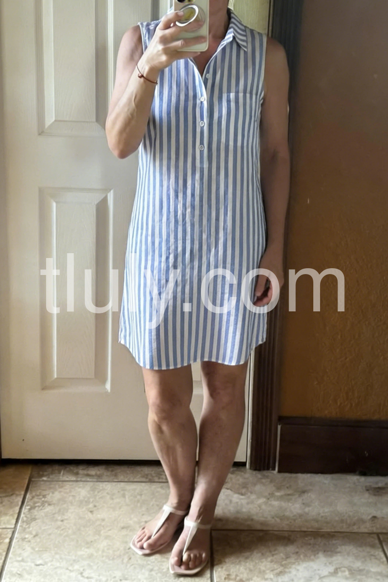 This striped sleeveless shirt dress features a classic blue and white vertical pattern with a relaxed, effortless fit. The collared neckline and front button closure add a polished touch, while the asymmetrical hem offers a modern twist. Lightweight and breathable, it’s perfect for casual summer days. Ideal for beach outings, brunches, or laid-back errands. Pair with sandals or sneakers for a fresh, coastal look.