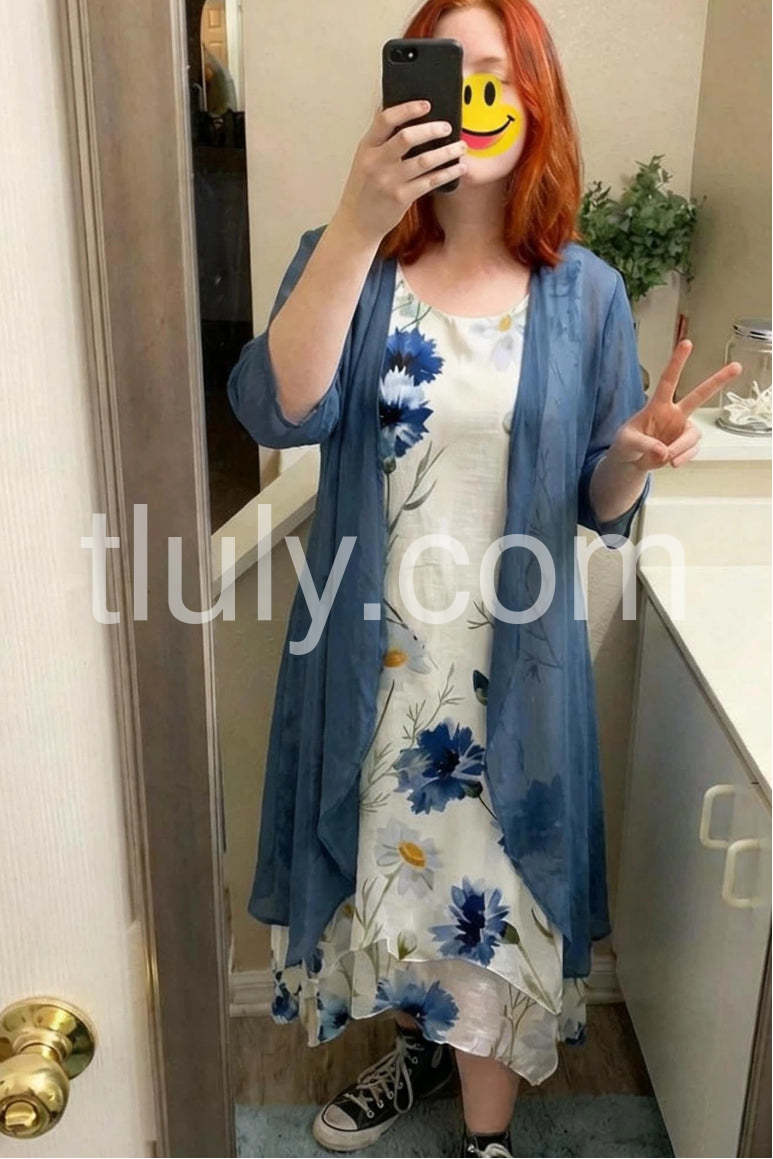 Discover the perfect blend of comfort and elegance in this Elegant Blue Floral Print Maxi Dress With Jacket, a chic two-piece ensemble that captures the essence of relaxed summer sophistication. The dress features a soft, flowing silhouette crafted from lightweight, breathable fabric—likely cotton or linen blend—with a white base adorned by a watercolor-inspired floral print of bold blue cornflowers, delicate daisies, and green stems, evoking a garden-in-bloom aesthetic. Its sleeveless design and asymmetrical hem add modern flair, while the relaxed fit ensures all-day comfort. Paired with a long, open-front denim duster cardigan in a soft chambray blue, the look is elevated with effortless style—perfect for layering on breezy days or adding a touch of casual polish. Styled here with platform sandals, layered necklaces, and statement sunglasses, it’s ideal for brunch dates, garden parties, or leisurely walks through charming neighborhoods.