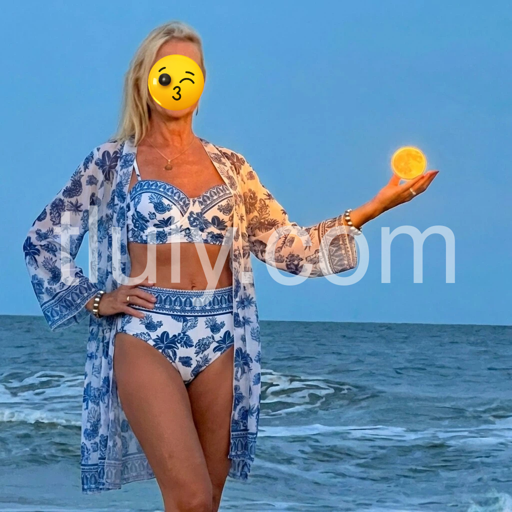 I absolutely love this swimsuit set! The blue-and-white pattern is so fresh, and the push-up style top gives a really flattering shape. The matching cover-up adds that perfect beach vibe soft, lightweight, and easy to wear over my bikini. Overall, it looks just like the photos and feels comfortable for a full day at the shore.