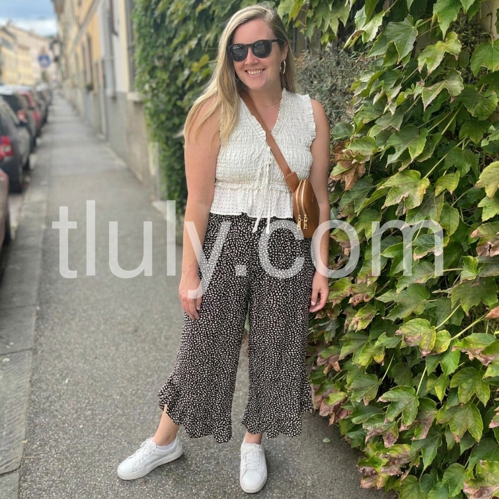 These high-waisted culottes feature a delicate white floral print on black. Wide-leg design with ruffled hem for a soft, feminine touch. Lightweight fabric perfect for warm weather. Ideal for casual wear or relaxed outings. Stylish and comfortable.