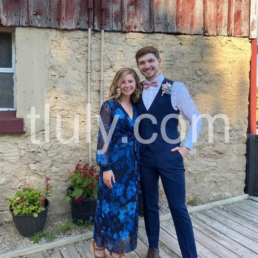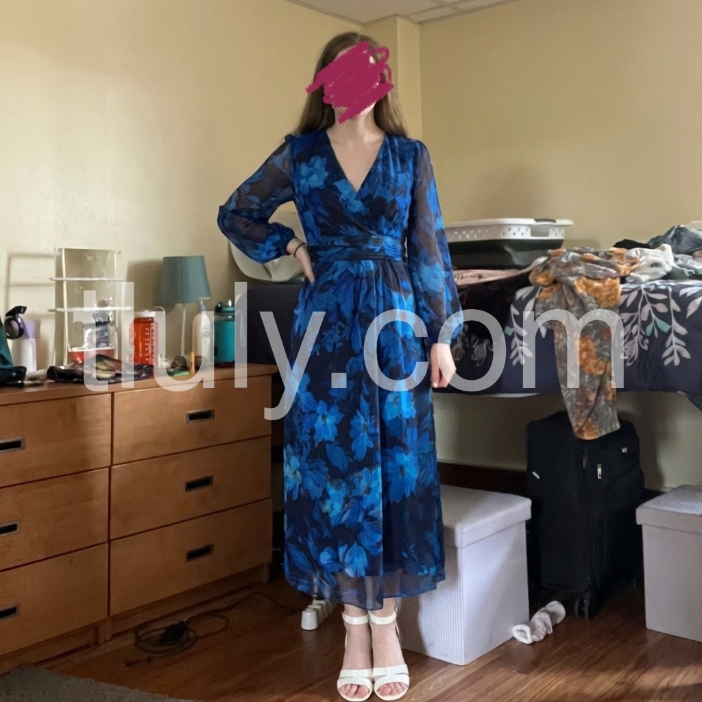 This mid-length wrap dress features a bold blue floral print on sheer fabric. The deep V-neck and long sleeves add sophistication. Self-tie waist enhances the silhouette. Perfect for evening events or stylish outings. Effortlessly chic with a touch of romance.
