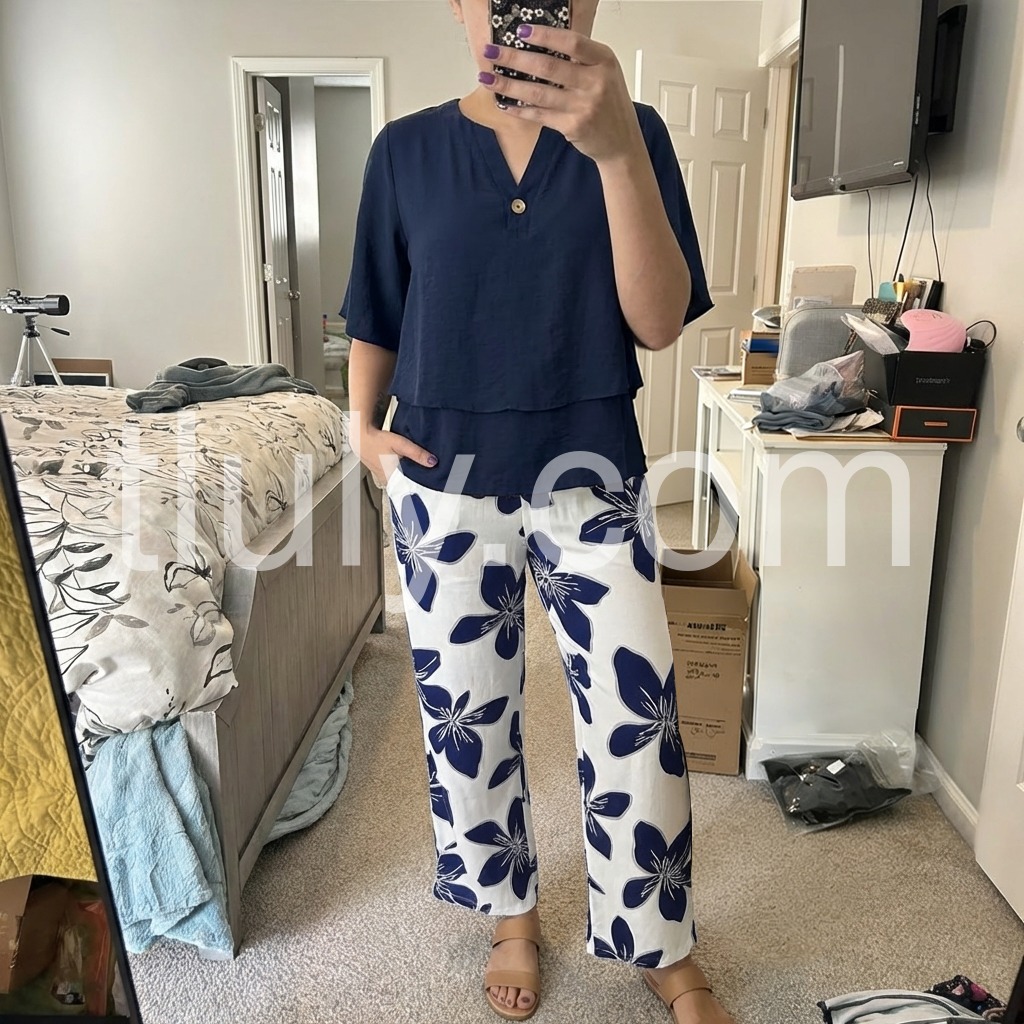 This coordinated set features a relaxed navy top with a layered hem and a single-button detail. Paired with white pants in bold navy floral prints for a beach-ready look. Lightweight fabric perfect for warm weather. Ideal for resort wear or casual outings. Effortlessly elegant and easy to style.
