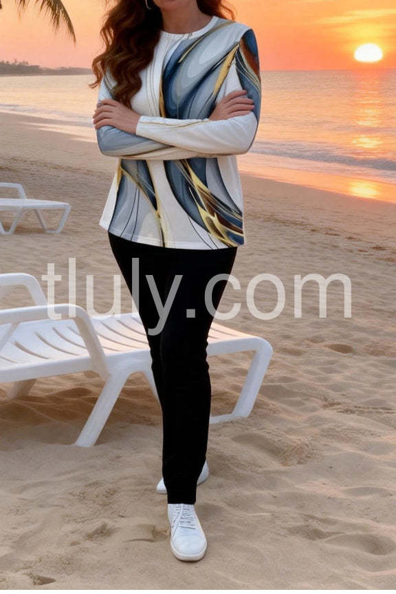 Elevate your wardrobe with this Stunning Geometric Print Round Neck Long Sleeve Top. Designed with a modern geometric pattern, it offers a sophisticated look suitable for both professional and casual settings. The round neck and long sleeves provide comfortable coverage, making it ideal for layering or wearing alone. Crafted to combine style and practicality, this top enhances your outfit with a contemporary edge while ensuring all-day comfort.