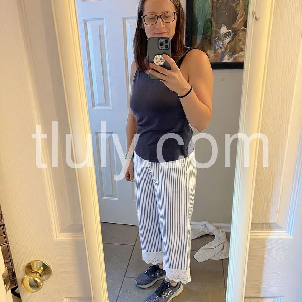 These relaxed-fit pants feature vertical blue and white stripes with a delicate lace trim at the hem. Elastic waistband and side pockets for comfort. Lightweight fabric perfect for warm weather. Ideal for beach days or casual outings. Effortlessly stylish and breezy.