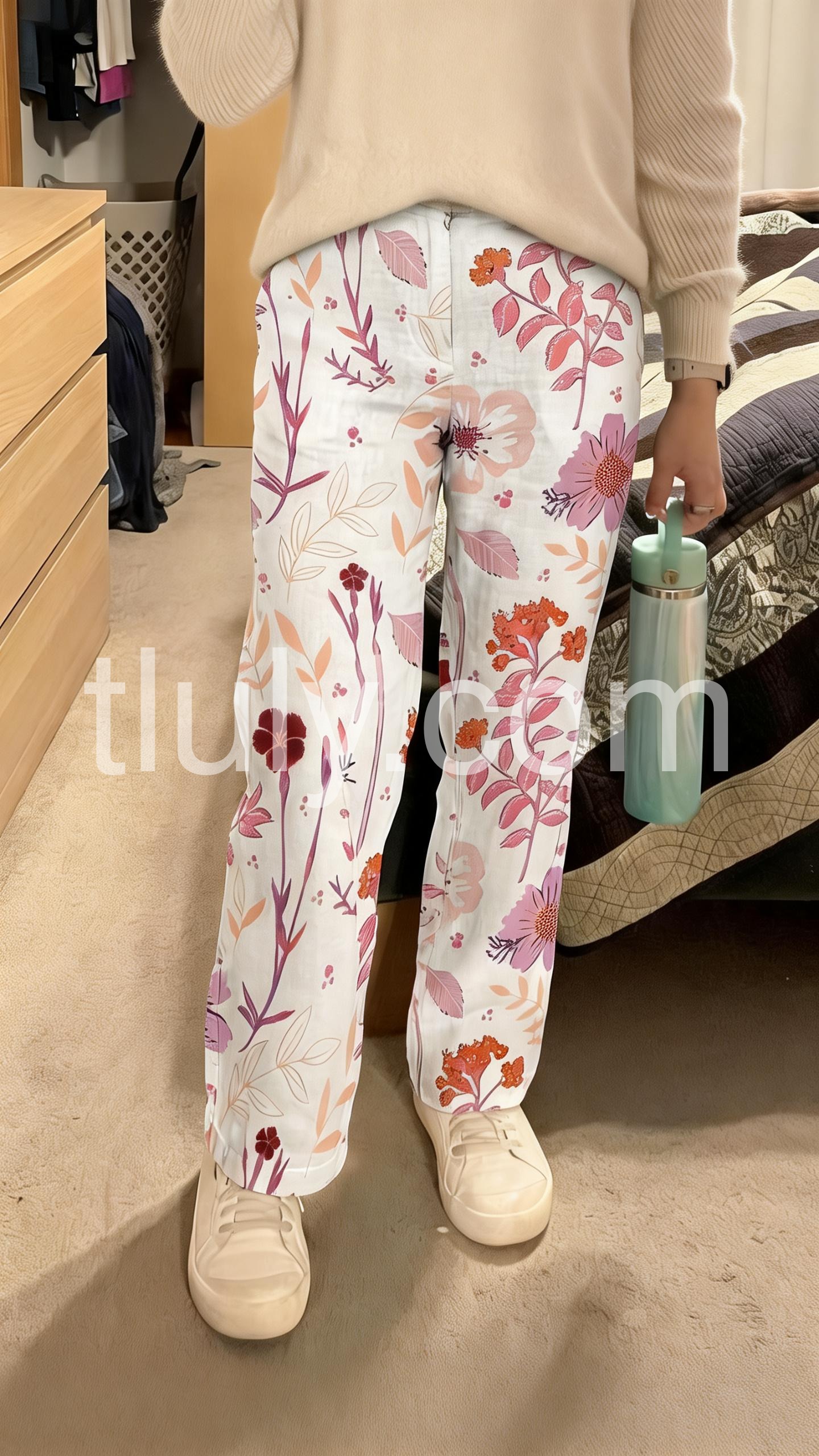 These loose-fit pants feature a vibrant floral pattern in soft pinks, purples, and oranges on a white base. Elastic waistband with side pockets for comfort. Wide-leg design with a relaxed, flowing silhouette. Perfect for casual wear or garden outings. Lightweight fabric ideal for warm days.
