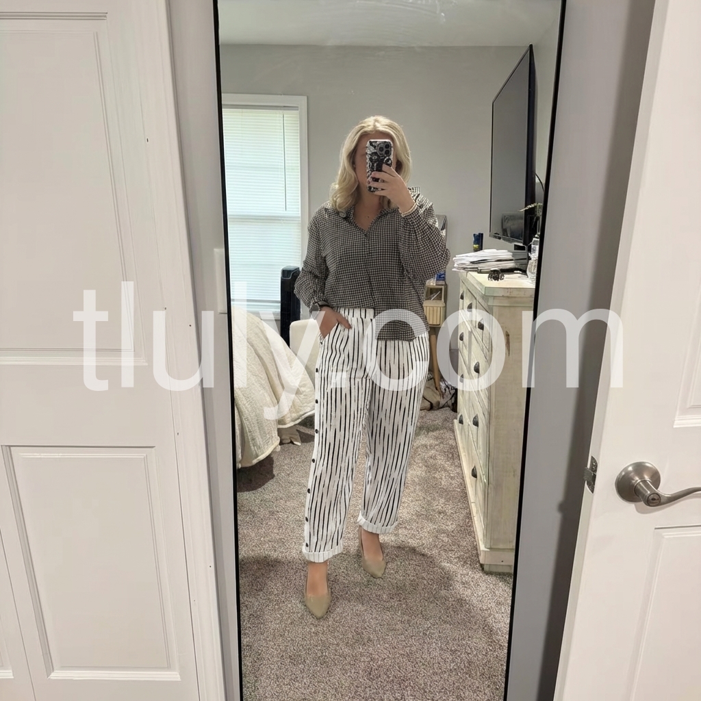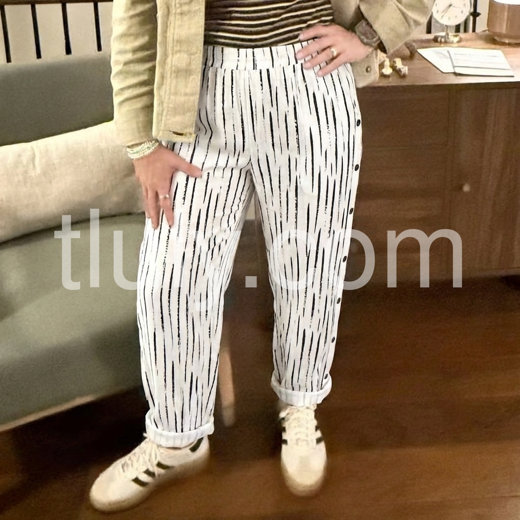 These loose-fit pants feature a modern black abstract stripe print on a white base. Side button details add a unique touch. Elastic waistband and cuffed hems for comfort. Perfect for casual outings or beach days. Effortlessly chic with a relaxed silhouette.