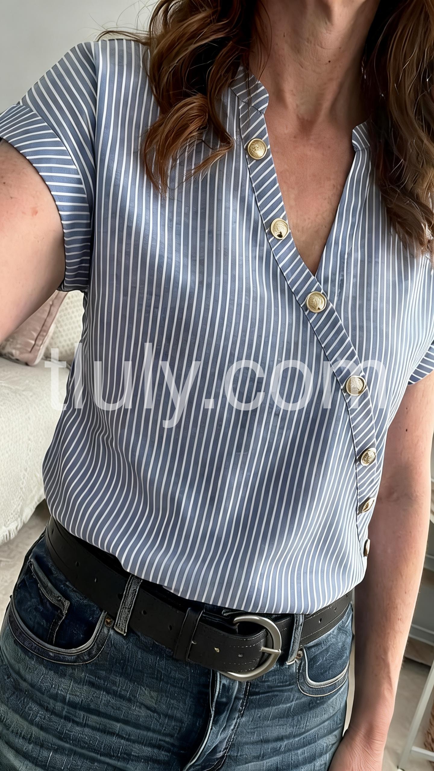 This fitted top features vertical blue and white stripes with a stylish diagonal button closure. Short flutter sleeves and a V-neckline for a feminine touch. Lightweight fabric perfect for warm weather. Ideal for casual outings or everyday wear. Effortlessly chic and comfortable.