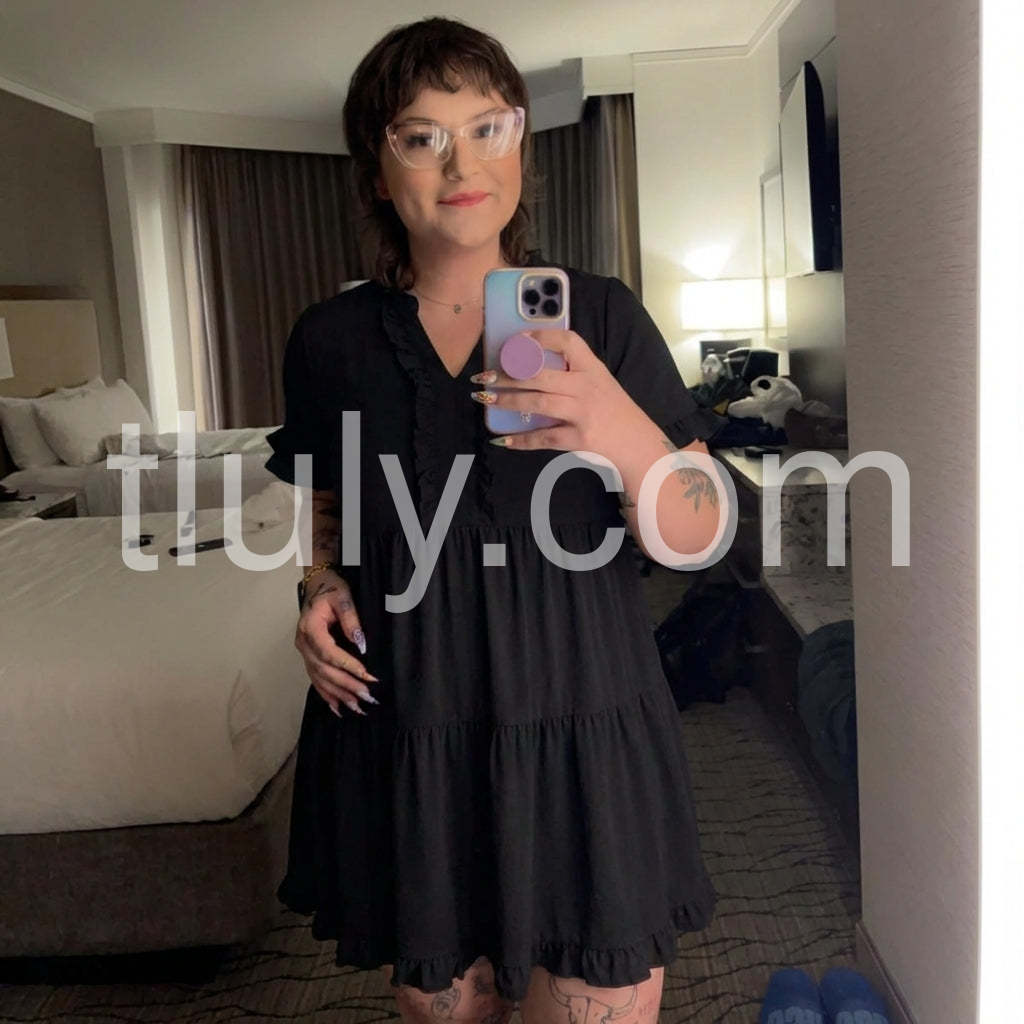 Style# 1544556Elevate your everyday look with this Black Tiered Ruffle Short Sleeve Mini Dress, a charming and feminine silhouette that blends timeless elegance with modern comfort. Crafted from soft, lightweight fabric—likely satin or crepe—with a subtle sheen, this mini dress features a flattering V-neckline adorned with delicate ruffles that add a touch of romance and detail. The short flutter sleeves are finished with matching ruffled edges, enhancing the dress’s playful yet sophisticated vibe. A tiered skirt design creates gentle volume and movement, making it perfect for casual outings, brunch dates, or relaxed social gatherings. The mid-length hem offers versatility, while the flowy fit ensures ease and comfort all day long. Paired here with a statement necklace and a structured tote, it strikes the perfect balance between chic and effortless. Whether you're running errands or meeting friends for coffee, this black dress brings grace, style, and understated glamour to any occasion.
